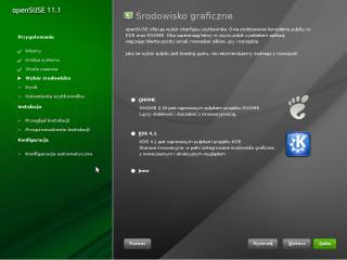 Teraz musimy wybrać środowisko graficzne. Do wyboru mamy przede wszystkim KDE 4.1 oraz GNOME. Dodatkowo mamy opcję "Inne" gdzie znajdziemy starsze wydanie KDE 3.5 oraz inne środowiska graficzne.
