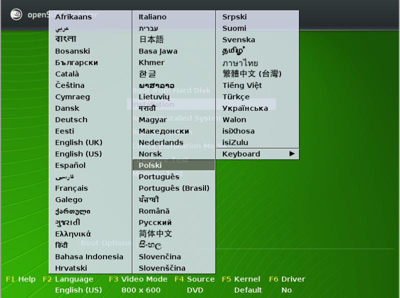 W menu możemy wybrać język jaki preferujemy (wystarczy nacisnąć F2), preferowaną rozdzielczość ekranu (klawisz F3) lub w razie problemów z instalacją inną wersję jądra systemu.
