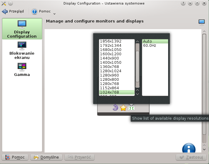 Aktualnie system sam określa właściwą rozdzielczość ekranu na podstawie danych otrzymanych od monitora. Poniżej znajduje się opis zmiany domyślnych parametrów w KDE.