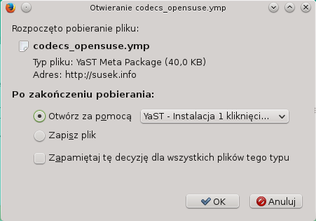 Z powodów prawnych dystrybucja openSUSE nie jest wyposażona w zamknięte kodeki audio wideo (np.: mp3). Przygotowaliśmy w związku z tym instalator korzystający z technologii one-click install, który umożliwia zainstalowanie wszystkich kodeków audio wideo prosto z naszej strony.