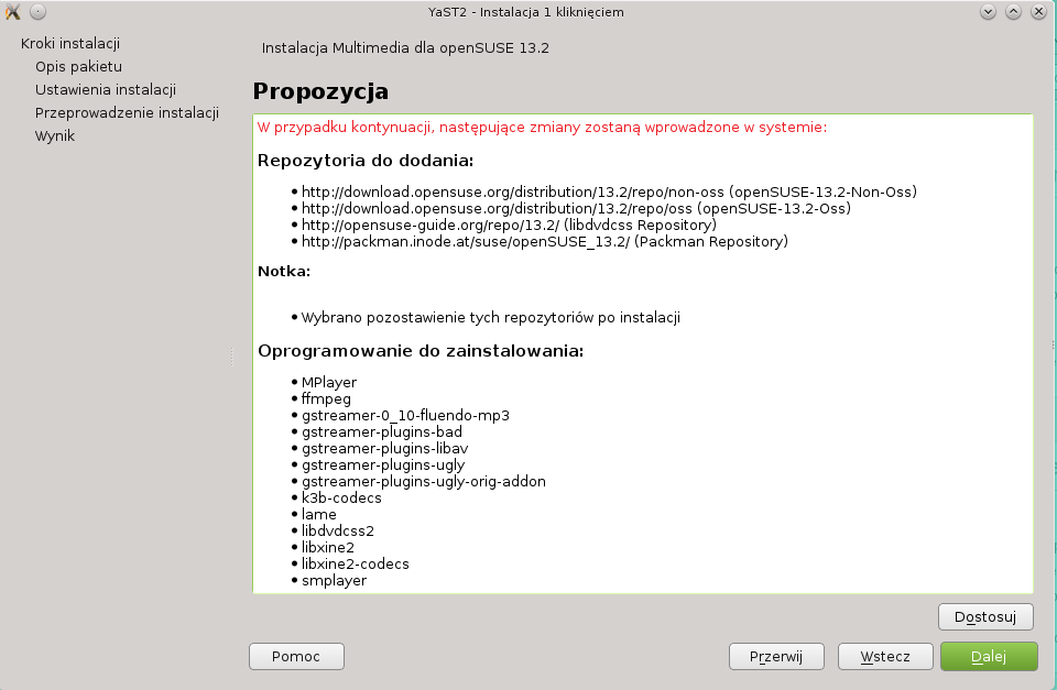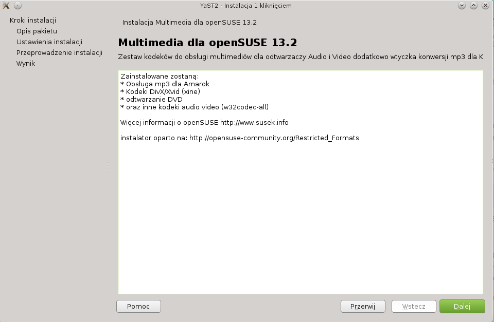 Instalator jest przetłumaczoną wersją instalatora opensuse-community.org/Restricted_Formats