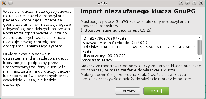 Podczas dodawania nowych repozytoriów oprogramowania musimy zaakceptować ich certyfikaty bezpieczeństwa wybierając "Zaufany"