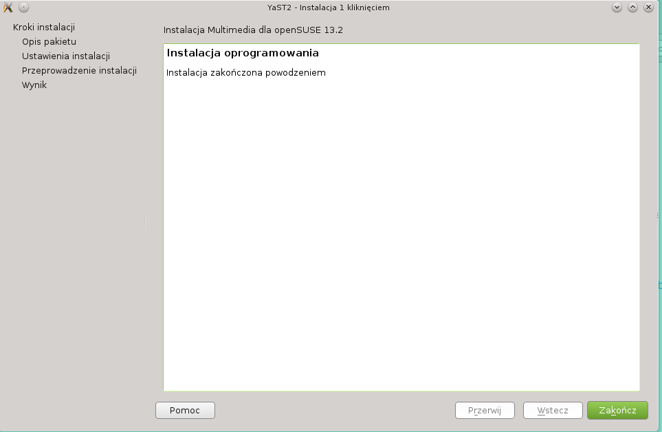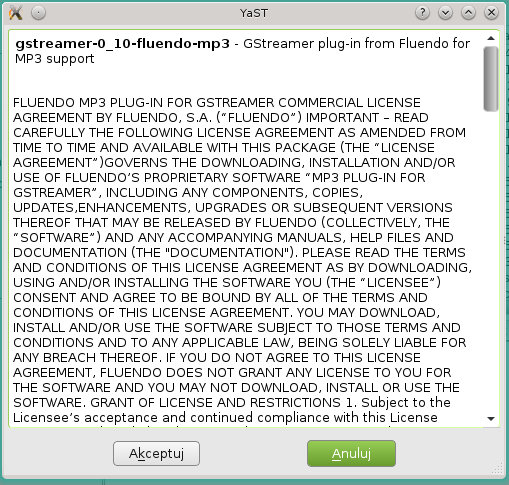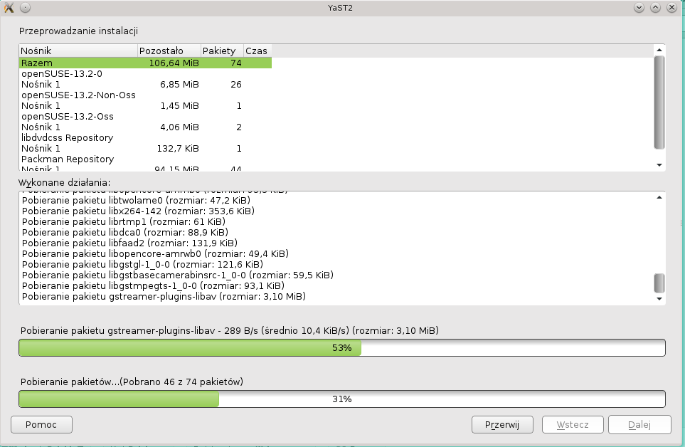Instalowałem z DVD. Dzisiaj zrobiłem jeszcze raz taki test jak Ty wczoraj. Przywróciłem sobie na dysku obraz podstawowej instalacji, ale niestety u mnie wynik jest negatywny czyli jest obraz, nie ma dźwięku. Jako menadżera okien ma XFCE, ale to chyba nie powinno mieć znaczenia. Klikam na obrazek powyżej, uruchamia się Yast i informuje, że dodane zostaną repozytoria. Zatwierdzam i następuje faza pobierania pakietów z sieci, po której następuje instalacja. Nie mam komunikatu, że powinienem zaznaczyć zmianę dostawcy. Instalacja kończy się powodzeniem (taki jest komunikat), ale dźwięku jak nie było tak nie ma. Z ciekawości uruchomiłem też instalatora na stronie opensuse-community.org/Restricted_Formats, ale nic to nie pomogło. Nie mam już pojęcia o co chodzi.