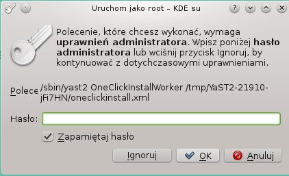 Aby przeprowadzić instalację musimy podać hasło administratora (domyślnie hasło pierwszego użytkownika przy instalacji systemu)