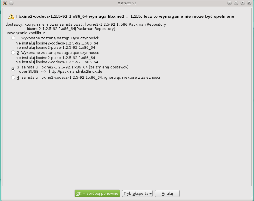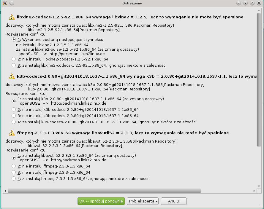 Jak nie spieprzą to żyć nie mogą.gdzie są multimedia 1 klick działające dla suse 13.1 ?Suse 13.1 najlepszy suse jaki był a za razem najszybszy reszta po nim to ślamazarne kobyły. Następujące pakiety nie mogą byc zainstalowane