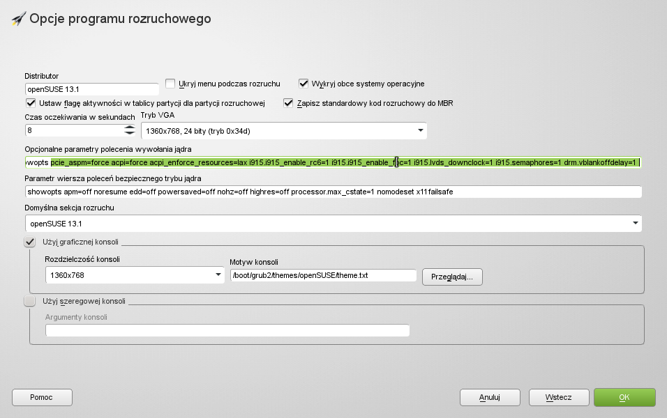 Następnie w opcjach programu rozruchowego, na końcu opcjonalnych parametrów polecenia wywołania jądra dopisujemy: