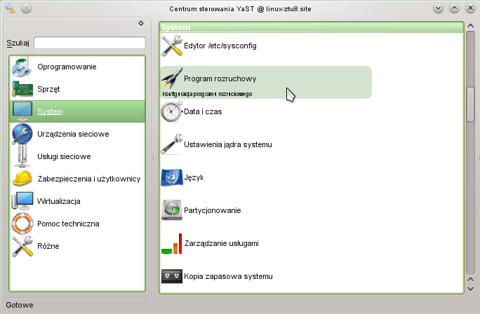 Na początek uruchamiamy program YaST i przechodzimy do konfiguracji programu rozruchowego.