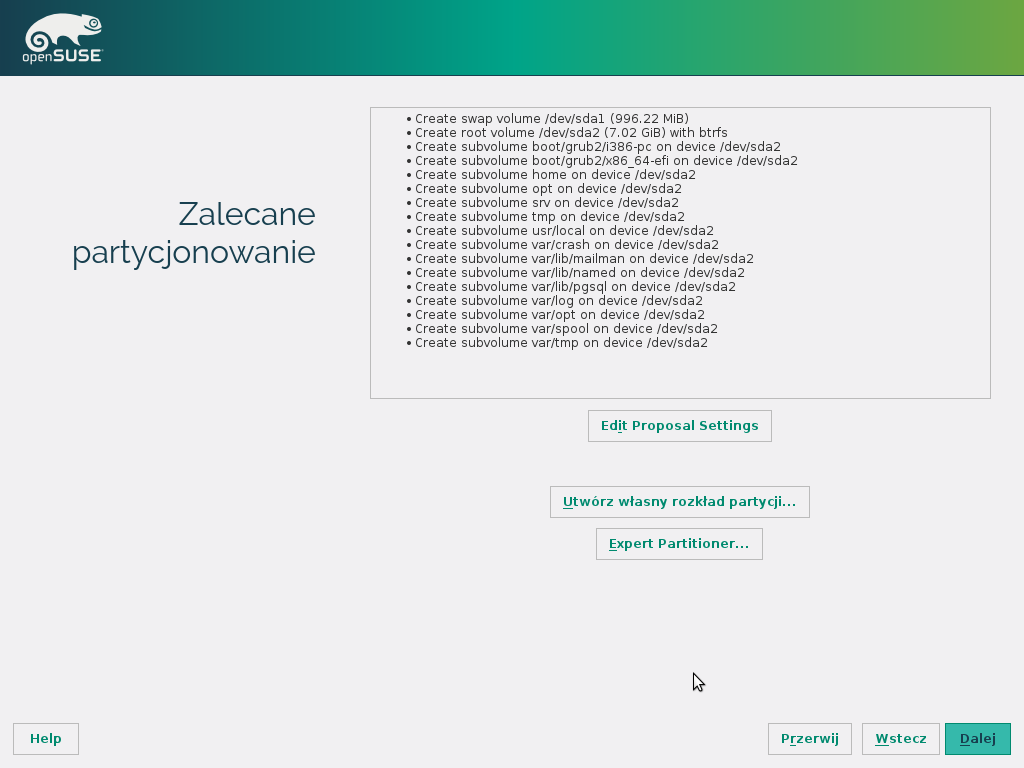 Jeśli chcemy samodzielnie ustawić partycje możemy wybrać opcję Utwórz własny rozkład partycji a następnie Własne partycjonowanie