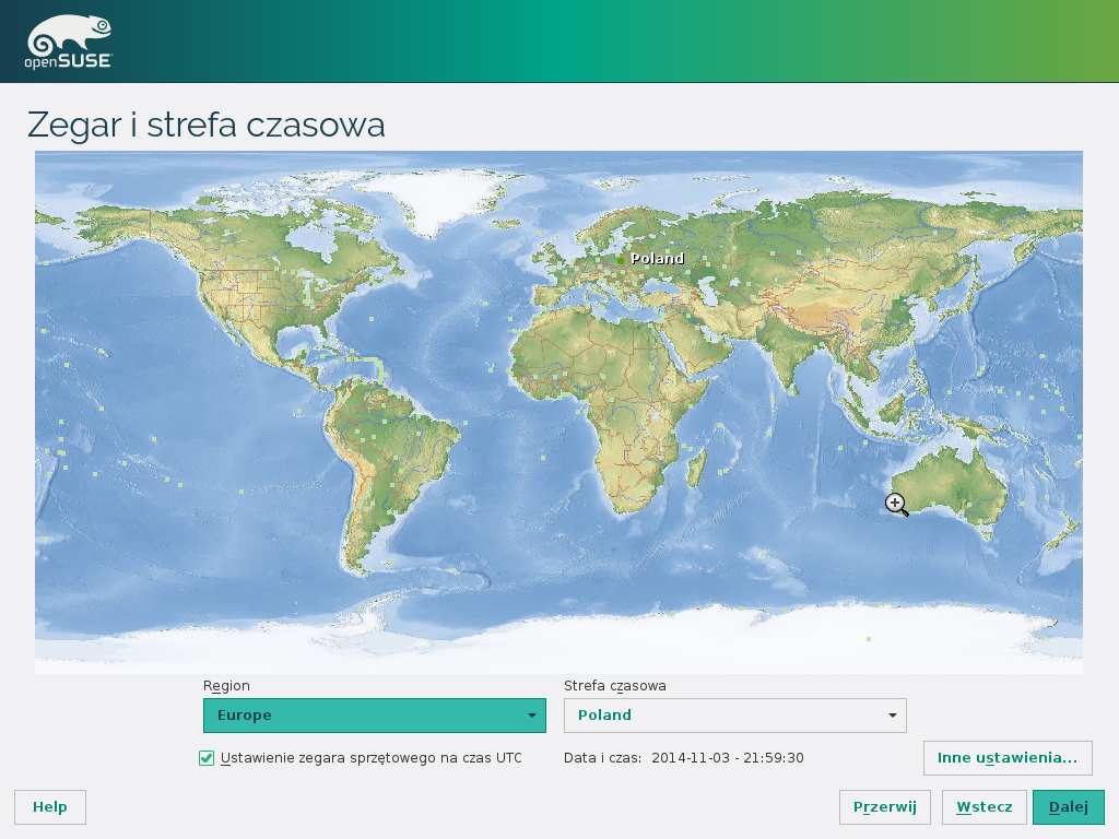 Pamiętać należy że zaznaczenie opcji "Ustawienie zegara sprzętowego na czas UTC" będzie działać tylko w przypadku gdy wszystkie inne zainstalowane systemy operacyjne też będą tak ustawione. Zalecam ustawienie tak aby wyświetlana godzina zgadzała się z realną.