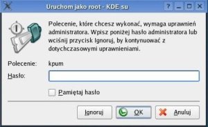 Aby go otworzyć wciskamy alt i f2 lub szukamy w menu start. Po kliknięciu na ikonę zostaniemy poproszeni o wpisanie hasła roota.
