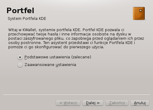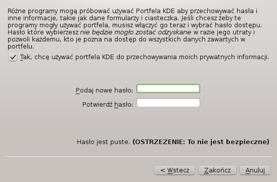 Skorzystanie z menadżera haseł - tutaj sprawa jest bardziej bezpieczna ponieważ hasła zostaną zakodowane. Podczas konfiguracji menadżera haseł możemy wybrać czy chcemy zabezpieczyć głównym hasłem dostęp do menadżera. W przypadku Kwallet jeśli zostawimy pole hasła puste, to hasło nie będzie wymagane.