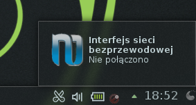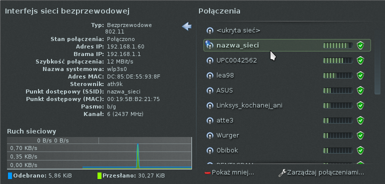 Koło zegarka (prawy dolny róg) znajduje się ikona NetworkManager'a klikając na nią powinno wyświetlić się nam okno dostępnych sieci bezprzewodowych,