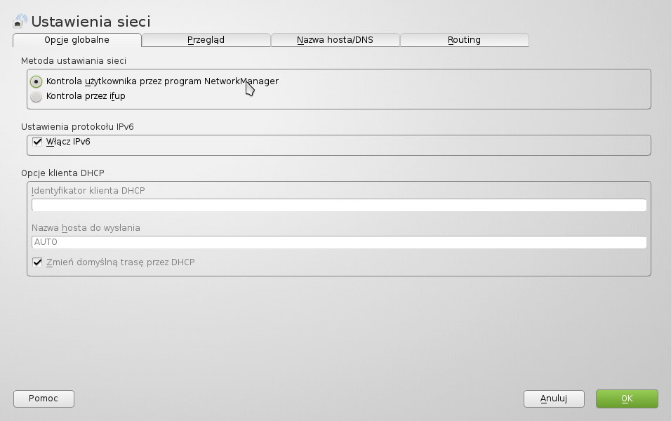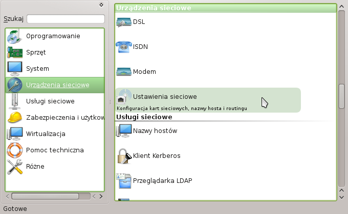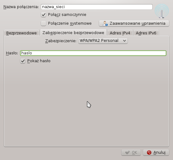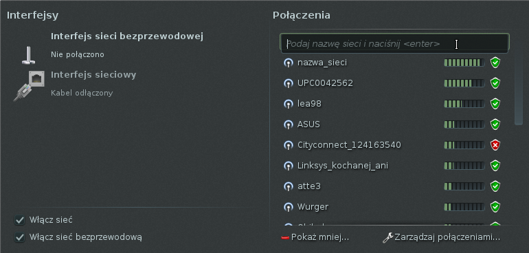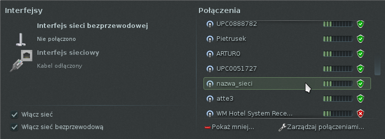 Jeśli mamy włączona kartę sieciową i konfigurację przez NetworkManagera możemy przejść do konfiguracji połączenia.