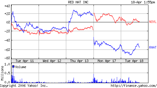 Powagi sytuacji dodaje wykres przedstawiający notowania Novell i Red Hat po artykule Financial Times