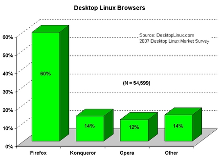 Wśród przeglądarek niepodzielnie króluje Firefox za którym znajduje sie Konqueror i Opera