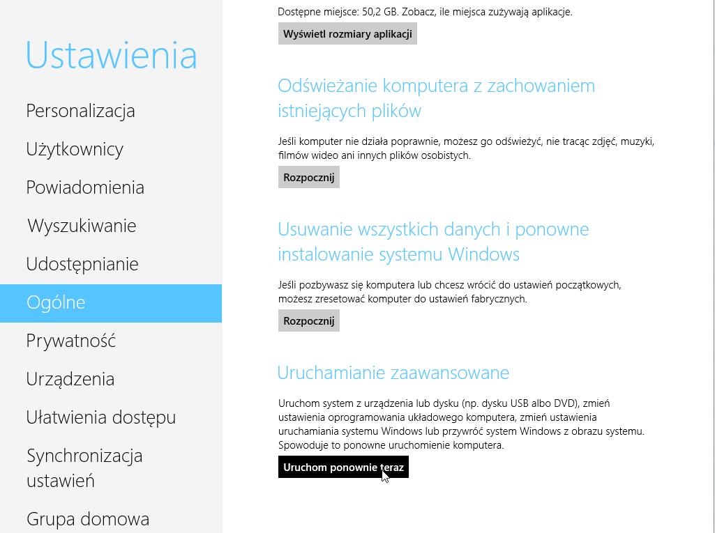 Zakładka Ogólne a następnie z samego dołu wybieramy w sekcji: Uruchamianie zaawansowane: Uruchom ponownie teraz