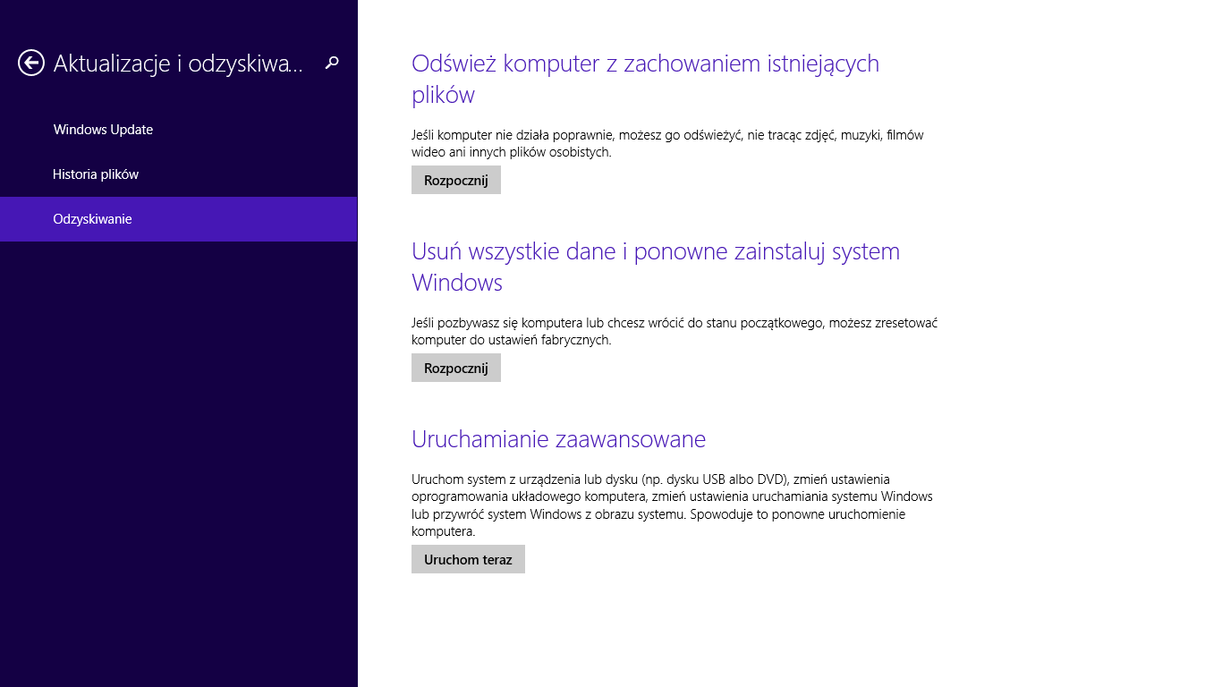 Zakładka Aktualizacje i odzyskiwanie, następnie zakładka Odzyskiwanie i wybieramy w sekcji Uruchamianie zaawansowane: Uruchom teraz