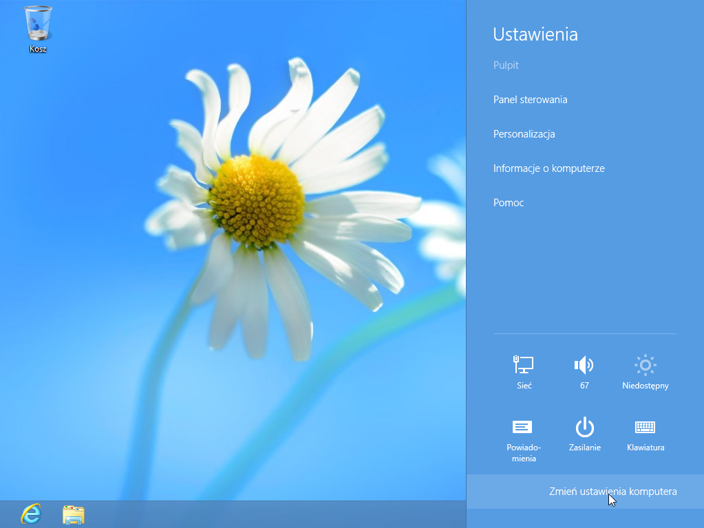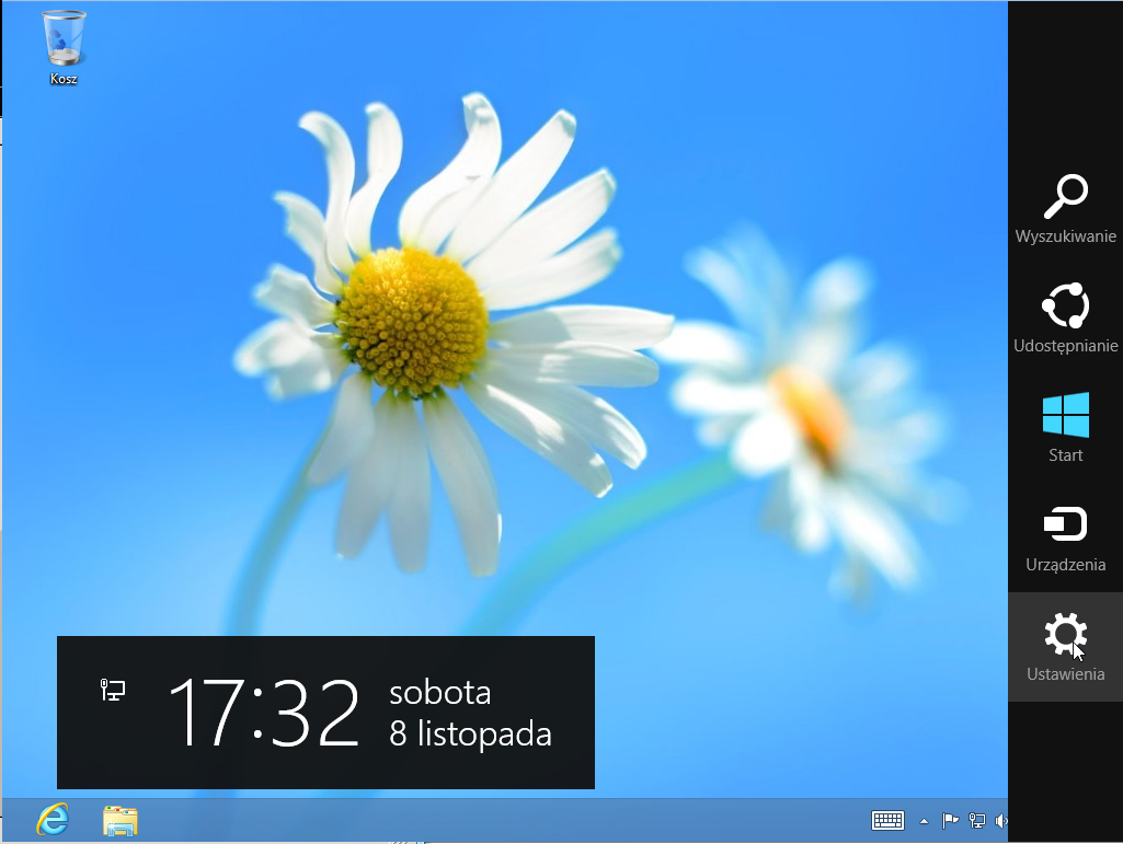 Podpinamy USB lub wsuwamy płytę instalacyjną po czym otwieramy panel boczny, np.: przesuwając kursor myszy w prawy górny róg ekranu i wybieramy: Ustawienia
